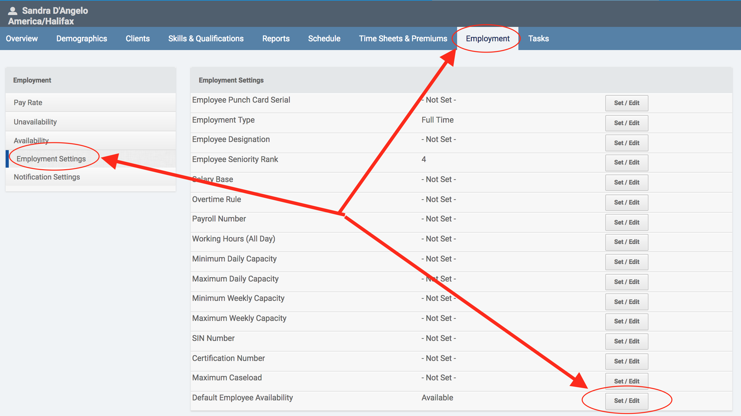 1. Navigate to Employee Profile>Employment>Employment Settings and click Set/Edit for the option Default Employee Availability.