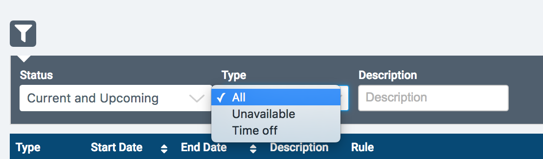 2. Unavailabilities/Time Off can be filtered by Past, Current and Upcoming, or All by clicking on the icon, as well as by Type (Unavailable/Time Off). They can also be searched by Description.