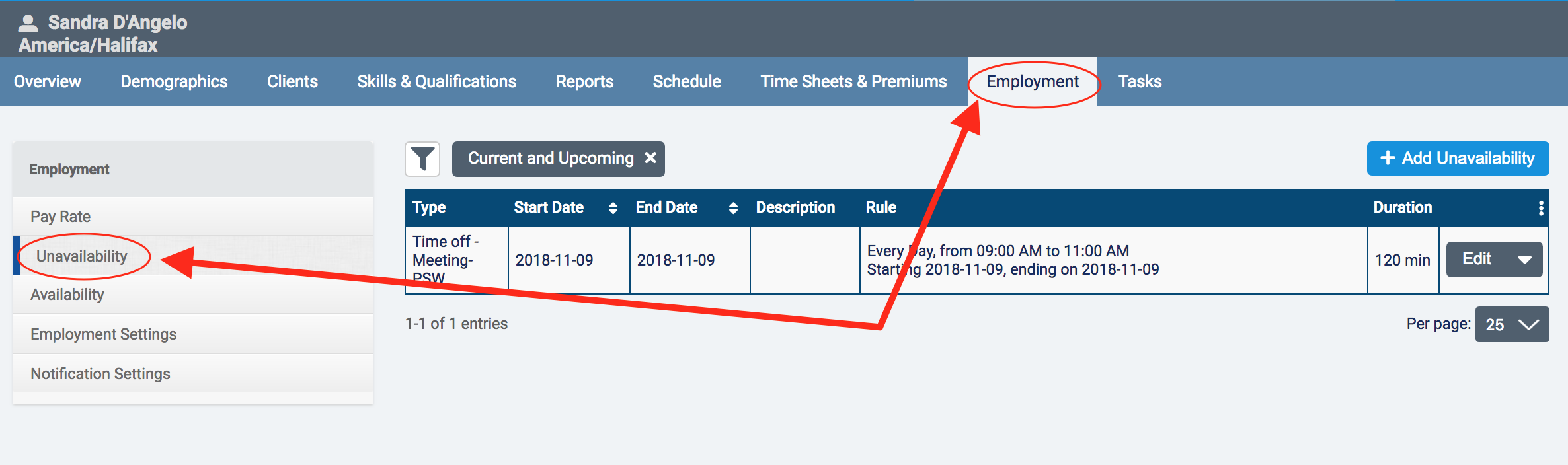 1. Navigate to Employee Profile>Employment>Unavailability.