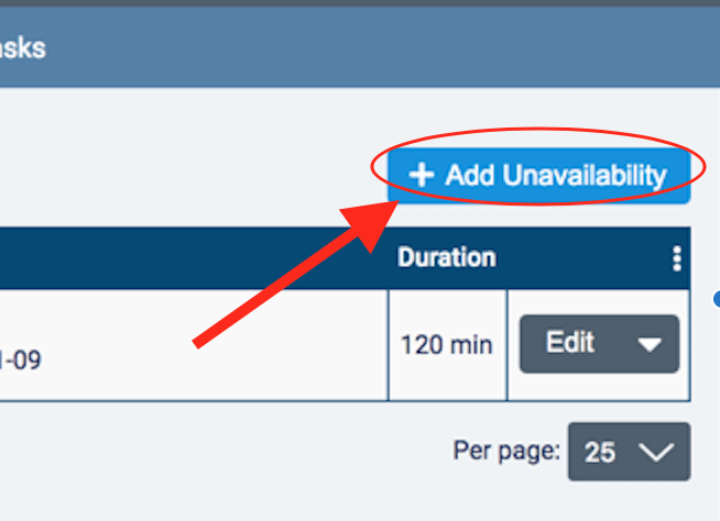 You can delete an unavailability for an employee by clicking the downward arrow next to Edit for the unavailability you wish to delete and selecting Delete.