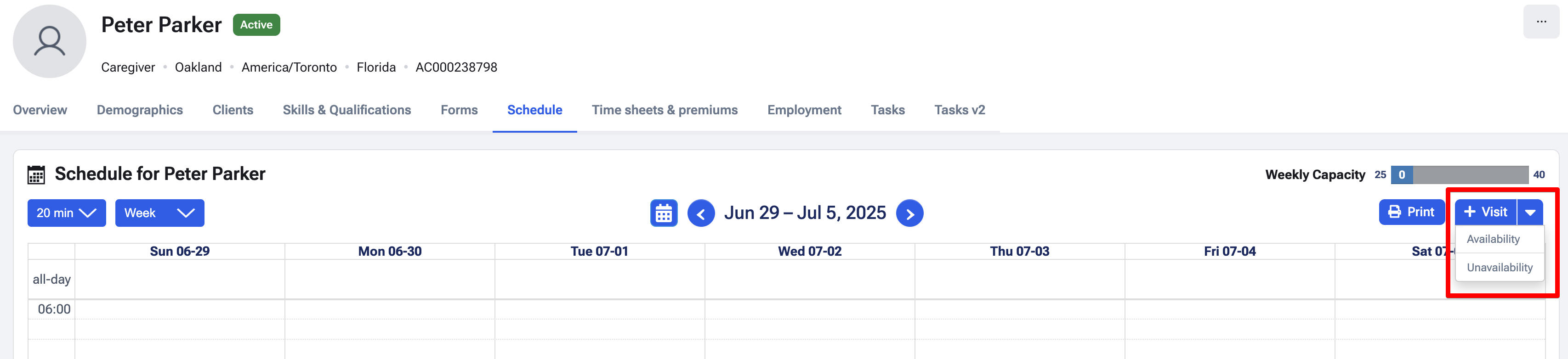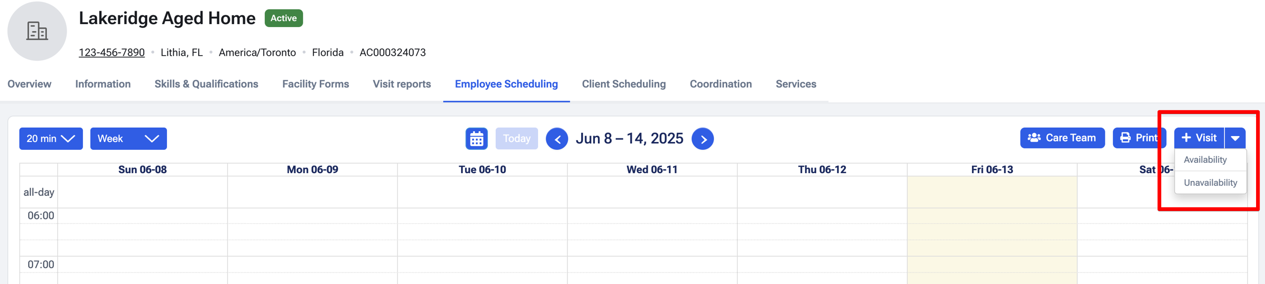 As of the August 2025 release, Employee availability can be added/removed directly from the Employee Schedule and the Facility Schedule.